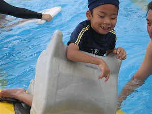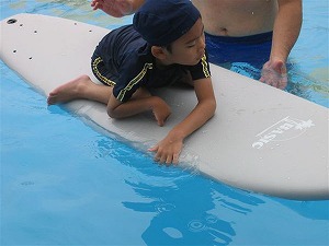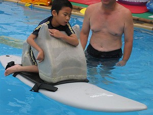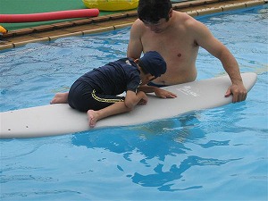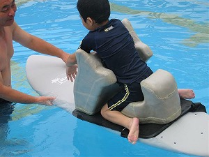 養護学校のプールで市販のソフトサーフボードと「ひげ工房」さんのサーフチェアーでテストされました。サーフチェアーは何度も試作⇒修正⇒テストを繰り返したそうです。さすがに座りやすそうです。 ソフトサーフボードは横方向が不安定なので、滑り落ちるような状態が続いたそうです。そんな中「はやて」君はボードから水に落ちることが楽しいようでした。ラッシュガードを着てる「はやて」君カッコいいです。ラッシュガードで、体温の低下や滑り落ちた時の擦り傷等の心配がありません。 |