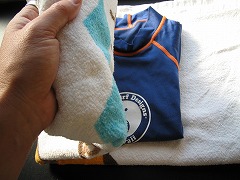 旅行先や、プールの練習などで、すぐにラッシュガードを乾かしたい時は、タオルを敷いた上にラッシュガードを置いて、タオルを押し当てて水分を吸収させるとすぐに乾きます。